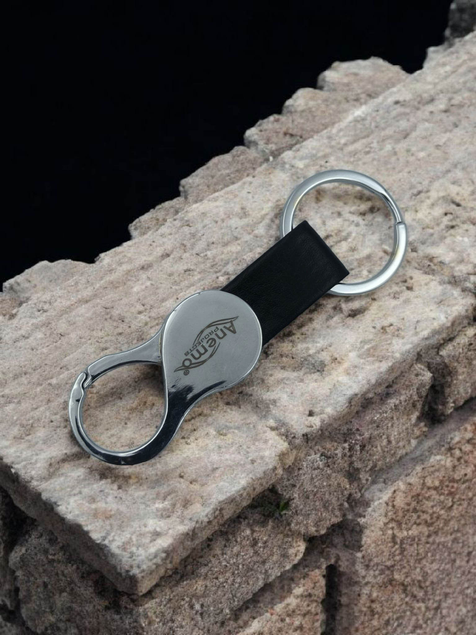 Premium quality metal keychain with black leather strap from Anemo. Ideal for daily use, gifting, and corporate branding.